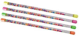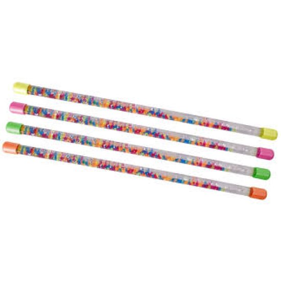 Glitterstaaf van 46 cm lang gevuld met glitters en geleurde balletjes. Prijs is per stuk. Geleverde kleur is afhankelijk van de voorraad.