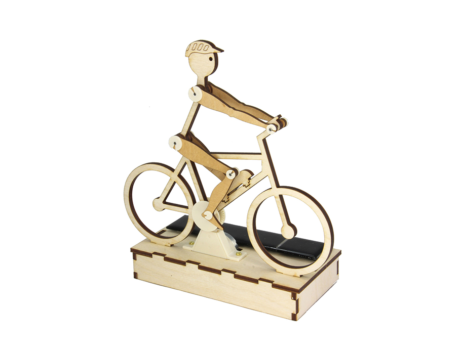 Bouw je eigen fiets + fietser met dit bouwpakket, bestaande uit meer dan 50 onderdelen!  Uiterst precieze, lasergesneden houten onderdelen zorgen ervoor dat het bouwen kinderspel is. En omdat de houtlijm al bijgeleverd is, kan het project meteen van start gaan.  De fietser kan naar wens worden geschilderd (verf niet meegeleverd) en het zonnepaneel zorgt ervoor dat het mannetje behoorlijk begint te trappen. Onvermoeibaar, volhardend en tegelijkertijd milieuvriendelijk. Vanaf 8 jaar.
