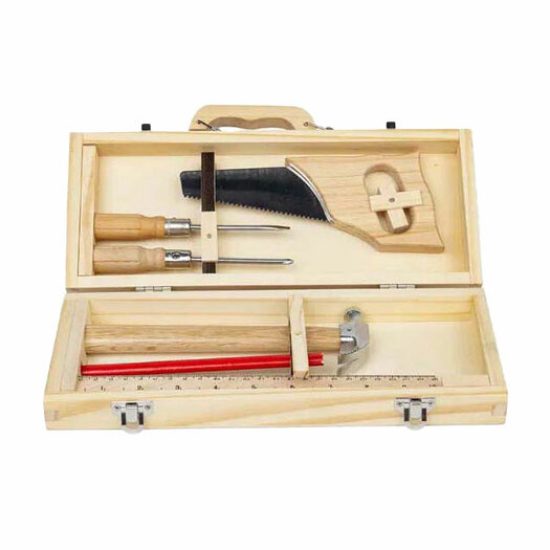 Kleine doe-het-zelvers en beginnende bouwers kunnen nieuwe vaardigheden aanleren met onze volledig functionele DIY Tool Box ! Deze wordt geleverd met zes kindvriendelijke gereedschappen , waaronder een miniatuurzaag, hamer, potlood, houten liniaal en twee schroevendraaiers, allemaal netjes opgeborgen in een compacte houten doos met een handvat.