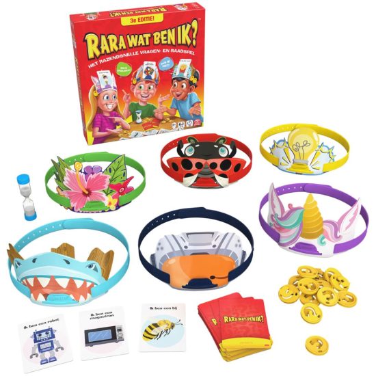 Het snelle vragenspel ‘Wat ben ik?’ is terug met een 3e editie. Dit Hedbanz-spel bevat 6 NIEUWE Hedbanz: pilotenbril, eenhoorn, haai, lieveheersbeestje, gloeilamp en bloemen, plus 69 gloednieuwe kaartillustraties, zoals ‘Ik ben een brownie’ en ‘Ik ben een pauw’. Kies je favoriete hoofdband en pak een plaatjeskaart zonder naar het plaatje te kijken. Stel creatieve ja/nee-vragen om je kaart te raden in de categorieën dieren, voorwerpen en voedsel. Verzamel als eerste 3 scorebadges en win.