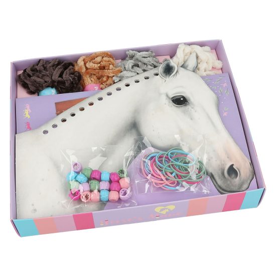 Met deze DIY-set van Miss Melody kun je zelf prachtige manen vlechten. In de doos zitten: 8 verschillende kartonnen paardenhoofden met gaten, 4 verschillende soorten garen (donkerbruin, lichtbruin, grijs, wit) en gekleurde elastiekjes en clips.