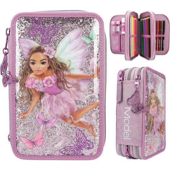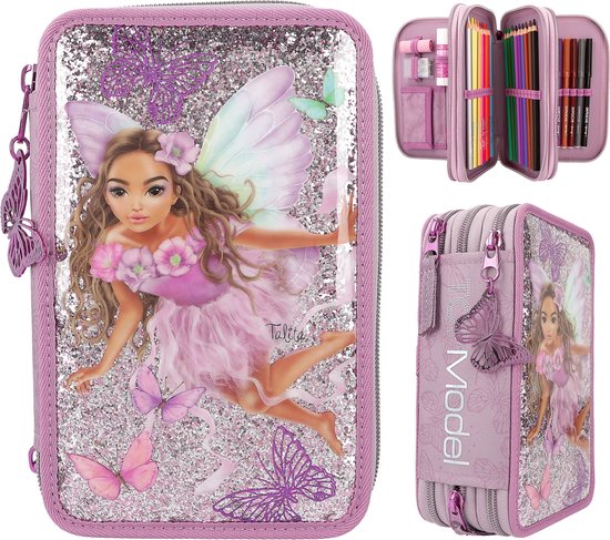 Fairy-fantastisch! De mauve kleurige TOPModel etui heeft een voorkant helemaal versierd met glitter en een fantasievol model die omgetoverd is tot een fee. En fladderend rondom aanwezig: delicate vlinders. Leuke blikvanger: de schitterende metalen vlinder aan de rits. De drie aparte vakken zijn compleet gevuld met 18 kleurpotloden, 18 viltstiften, 2 potloden, een puntenslijper, gum, liniaal, schaar en plakstift.