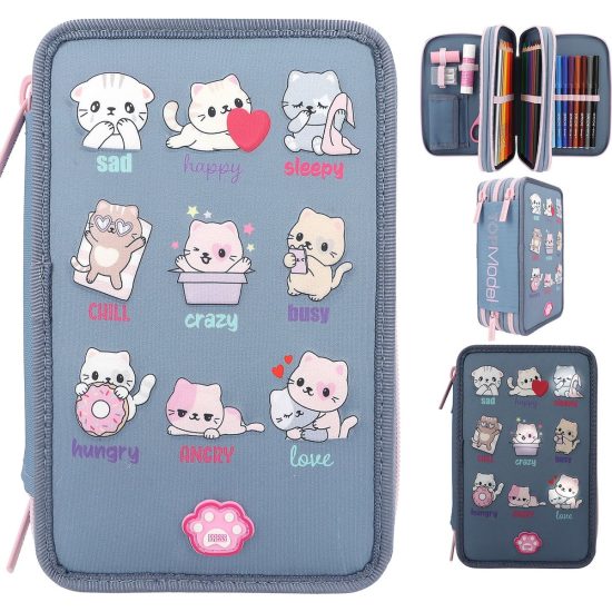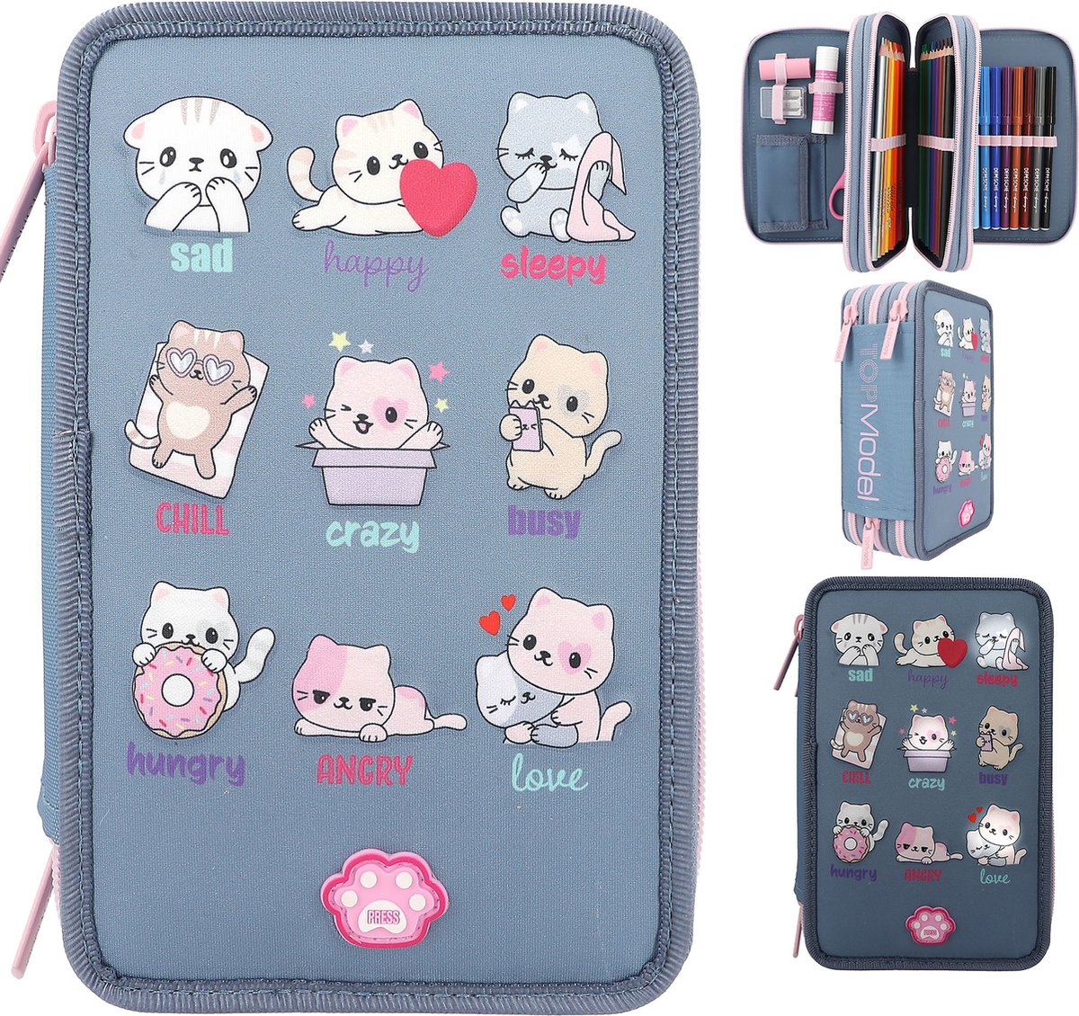 Moe, vrolijk, ontspannen, knuffelig? Hoe is je stemming? De schattige katten op het blauwe TOPModel etui verklappen het je. Druk je op de LED gaat er een lampje branden die van kat naar kat gaat en dan ca. 7 seconden toevallig blijft staan. De kat vertelt je dan hoe je je voelt.