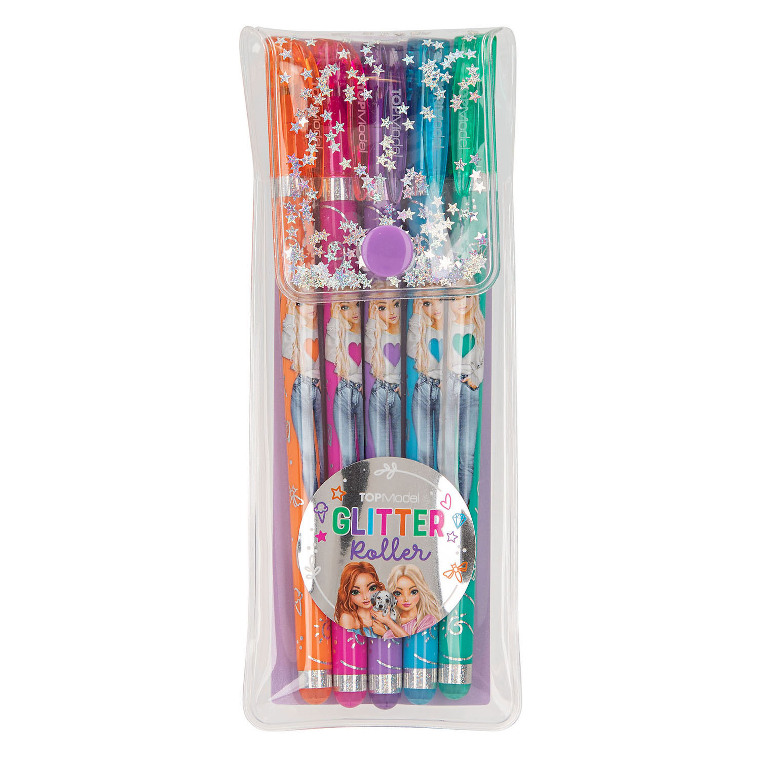Lol tijdens het schrijven en tekenen! Dat kan met de glitter gelpennen van TOPModel in de kleuren oranje, roze, paars, blauw en groen. Verpakt in een transparant tasje met zilveren holo-confetti in de flap. De vullingen zijn niet vervangbaar.