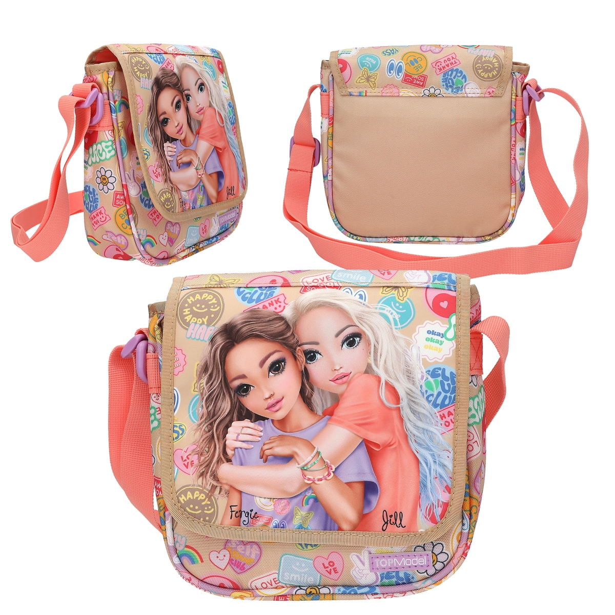 Batch boom! De TOPModel schoudertas in mooi beige en koraal heeft een afbeelding van twee modellen op de voorkante en een print van vrolijke batches op de voorkant en zijkant. De schouderband is in lengte verstelbaar. Handig: de ring om een hanger aan te bevestigen. Materiaal: 100 procent polyester. Maten: ca. 6,5x20x21 cm.