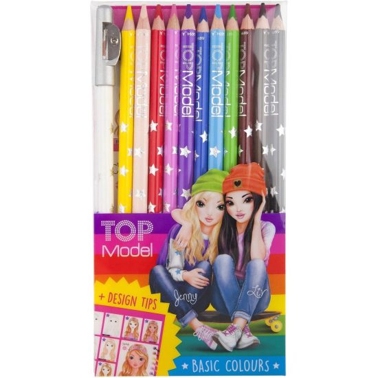 12x TopModel kleurenpower! Bij deze kleurpotloden met superzachte vulling en hoge kwaliteit kleuren hoort ook nog een puntenslijper en een kleine tekenschool. De kleuren zijn: wit, geel, beige, rood, roze, paars, donkerblauw, lichtblauw, groen, lichtbruin, donkerbruin en zwart. Jippie!