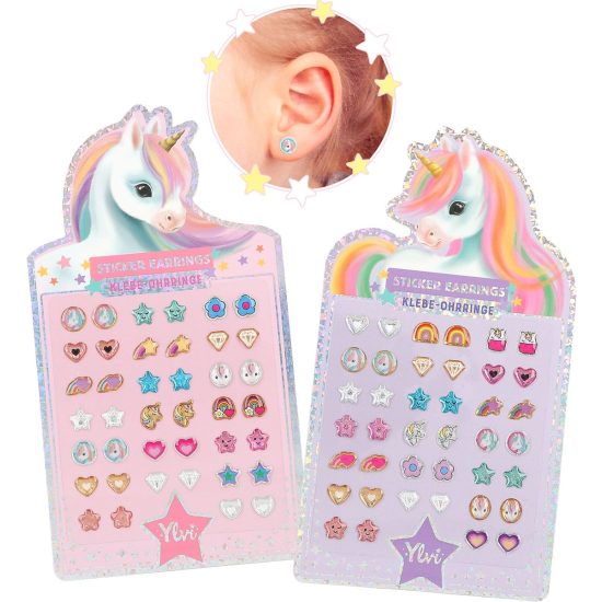 Super schitterend! Prachtige oorbellen om op te plakken in de vorm van een hartje, ster, diamant, bloem, regenboog en eenhoorn. Met veel kleur en glitter, gewoon typisch Ylvi.