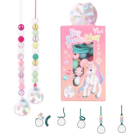 Met de DIY set van Ylvi kun je drie prachtige zonaanbidders maken. Hiervoor zit er bij: 42 gemengde kleurrijke kralen, 3 grote kralen met diamantoptiek, waarmee je het zonlicht kunt breken en 3 elastische banden (elk 80 cm). Hoe het werkt, kun je bekijken in een eenvoudige handleiding.